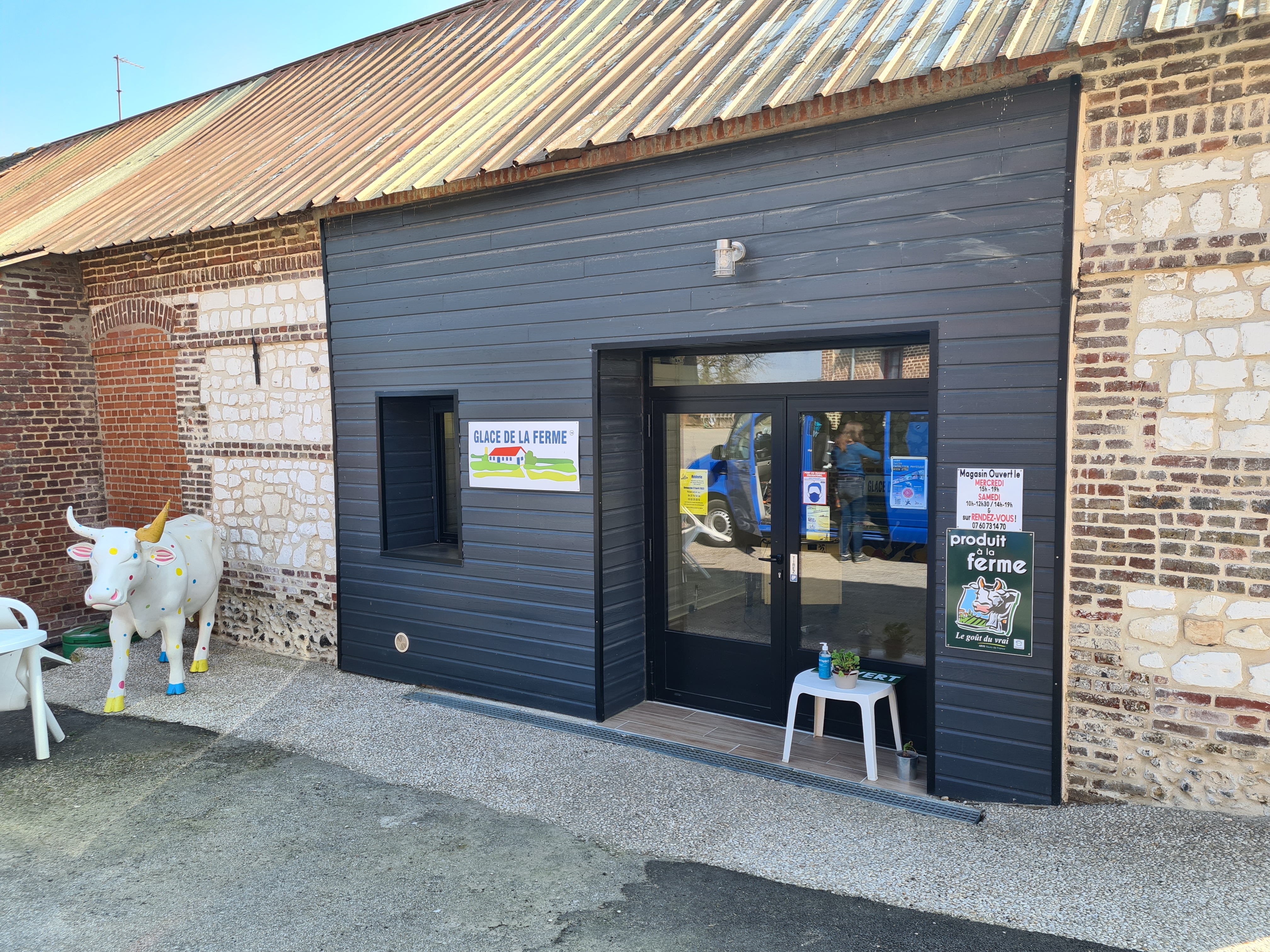 Jolie petite boutique dans la cour de la ferme. Une grande baie vitrée donne vue sur la fabrication, ce qui rend la boutique encore plus agréable. En ce qui concerne les glaces, beaucoup de choix dans les parfums et dans les conditionnements. Des glaces vraiment excellente et de qualité. Par exemple la citron meringuée avec des vrai morceaux de meringue, la speculos on a juste l'impression de croquer dans le biscuit simplement exquise, je déteste la glace à la pistache mais là elle est à tomber. Les tarifs sont tout à fait raisonnables pour des produits d'une telle qualité