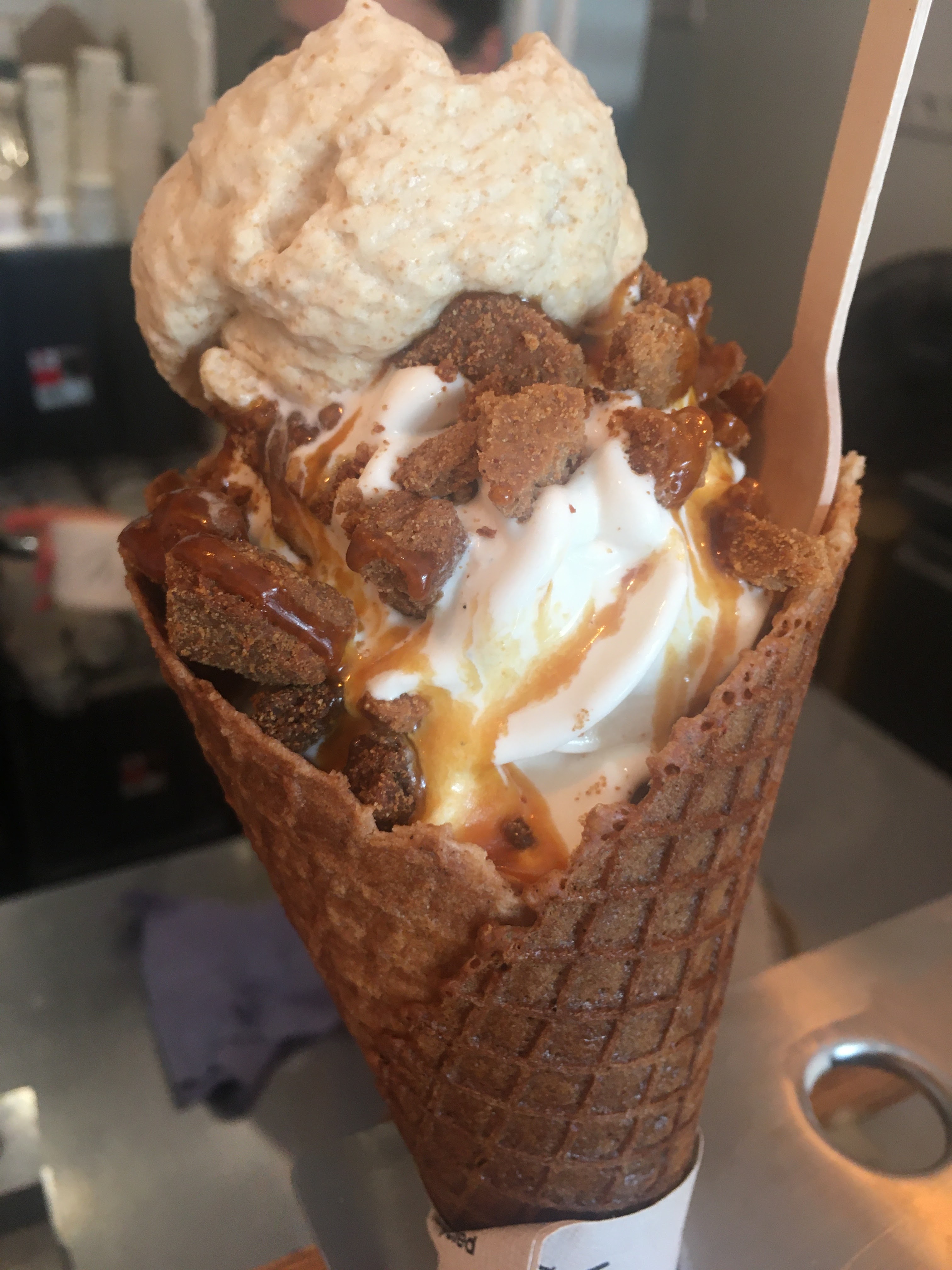 Des glaces « molles » à l’italienne avec des parfums du moment surprenants, et les coupes créatives sont géniales. Ok, j’ai aussi un coup de cœur pour le sandwich glacé de cookies, mais en réalité je n’ai pas pris tout en une fois.