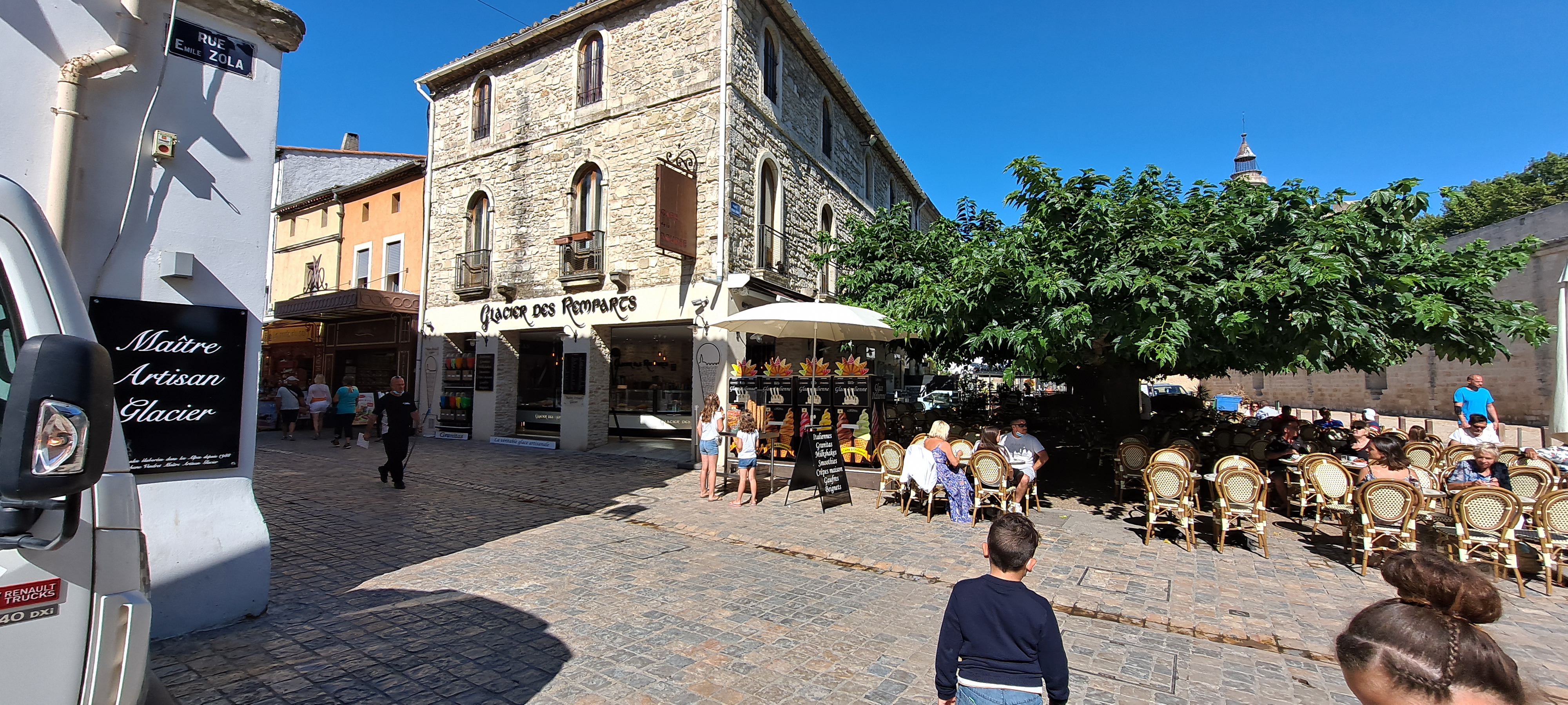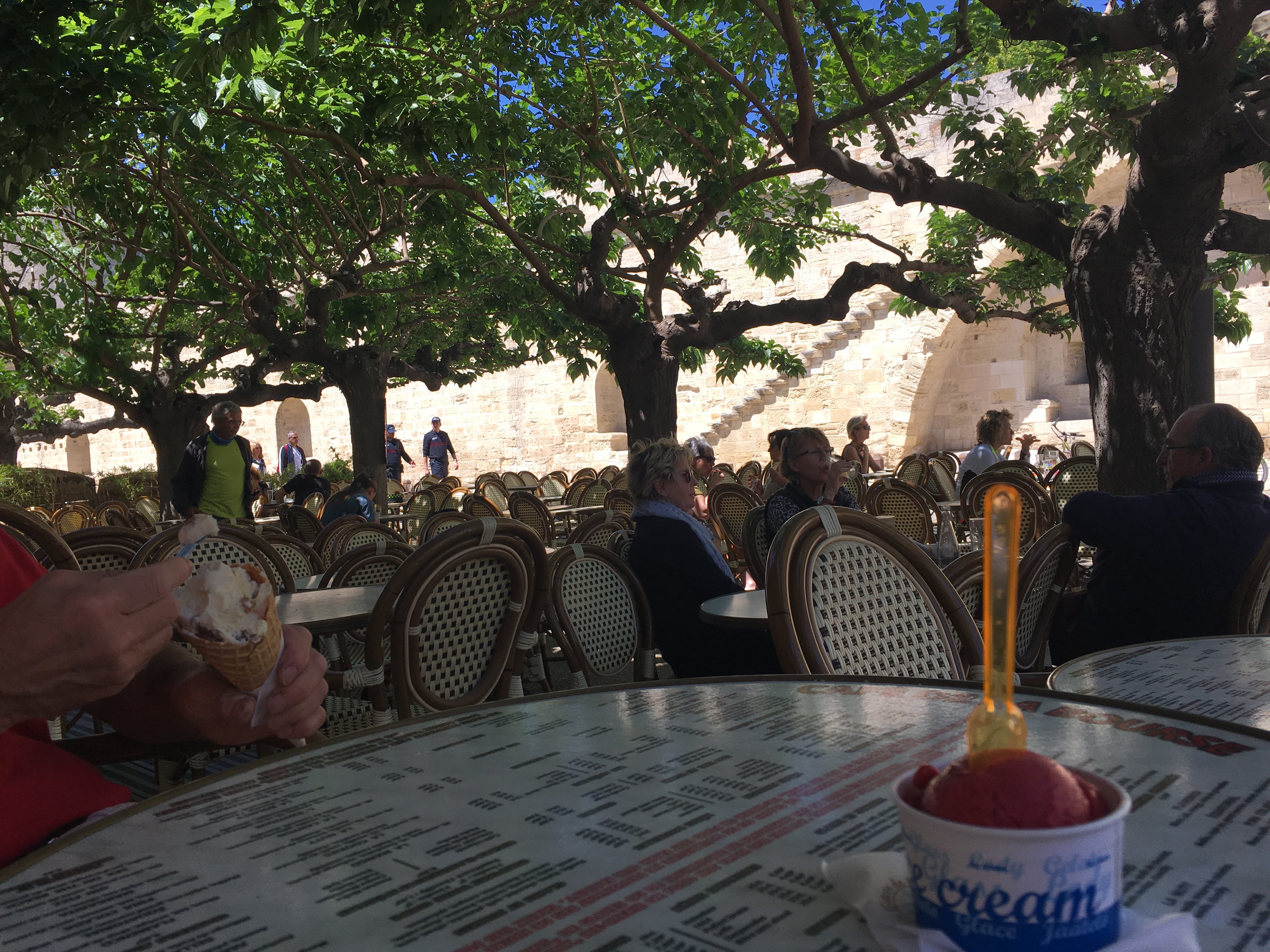 Qu’on est bien à l’ombre des arbres ( murier?) ! Les glaces sont bonnes et la vue sur les remparts agréable!