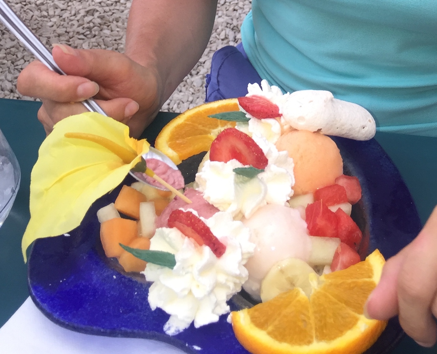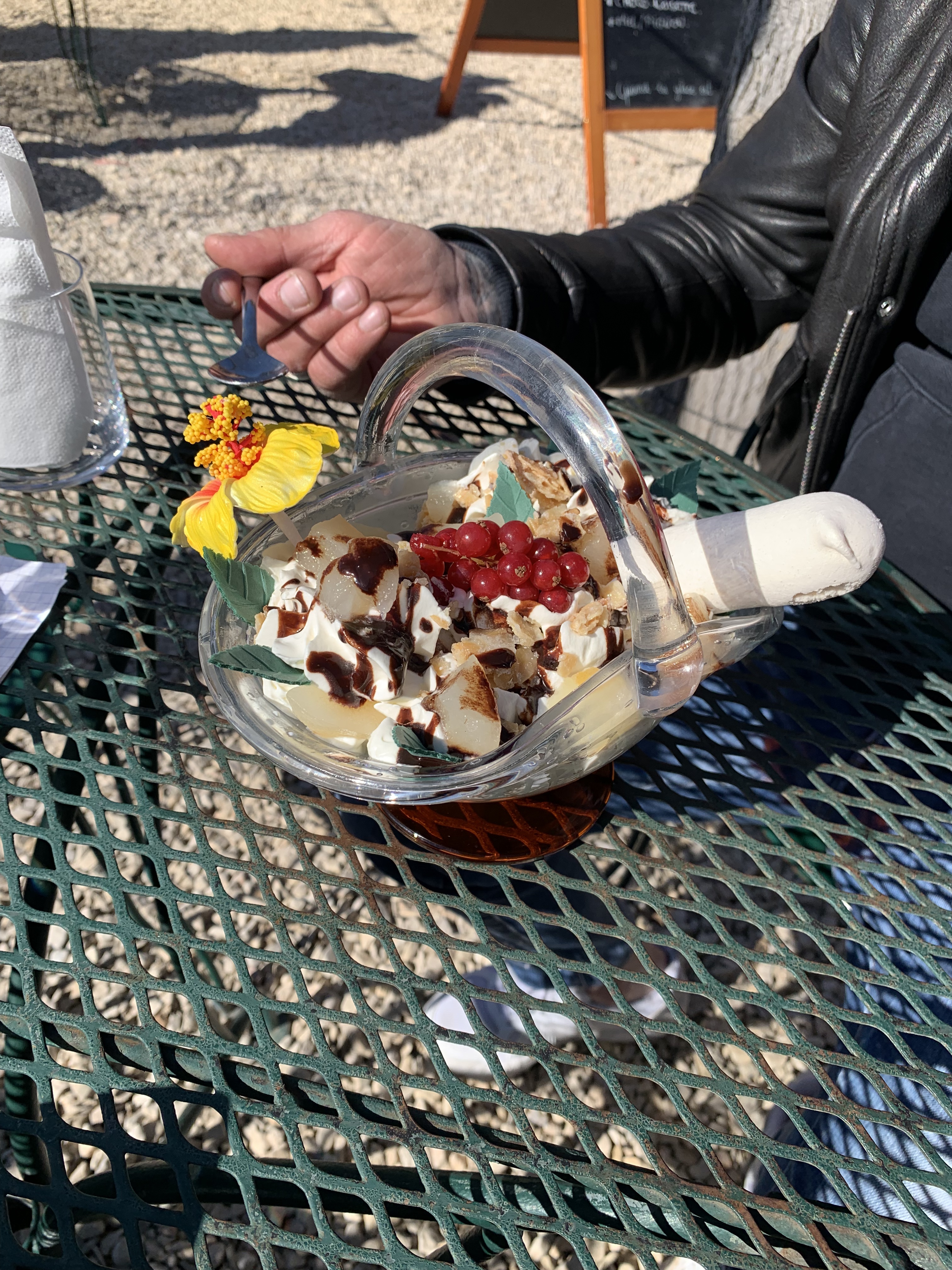 Arrivés vers 16:00, il faut attendre quelques instants à l’entrée, pour que le personnel vous convie à vous installer à l’extérieur à une table, la terrasse est orientée plein Ouest, en été il fait chaud et il est possible de déguster à l’intérieur de l’établissement pour éviter le désagrément de la chaleur, mais il est dommage de ne pas profiter du panorama tout en dégustant vos coupes de glaces. Il est possible d’acheter des bacs de glaces bien protégés pour le transport. Quelques instants très rafraîchissants avec des parfums surprenants.