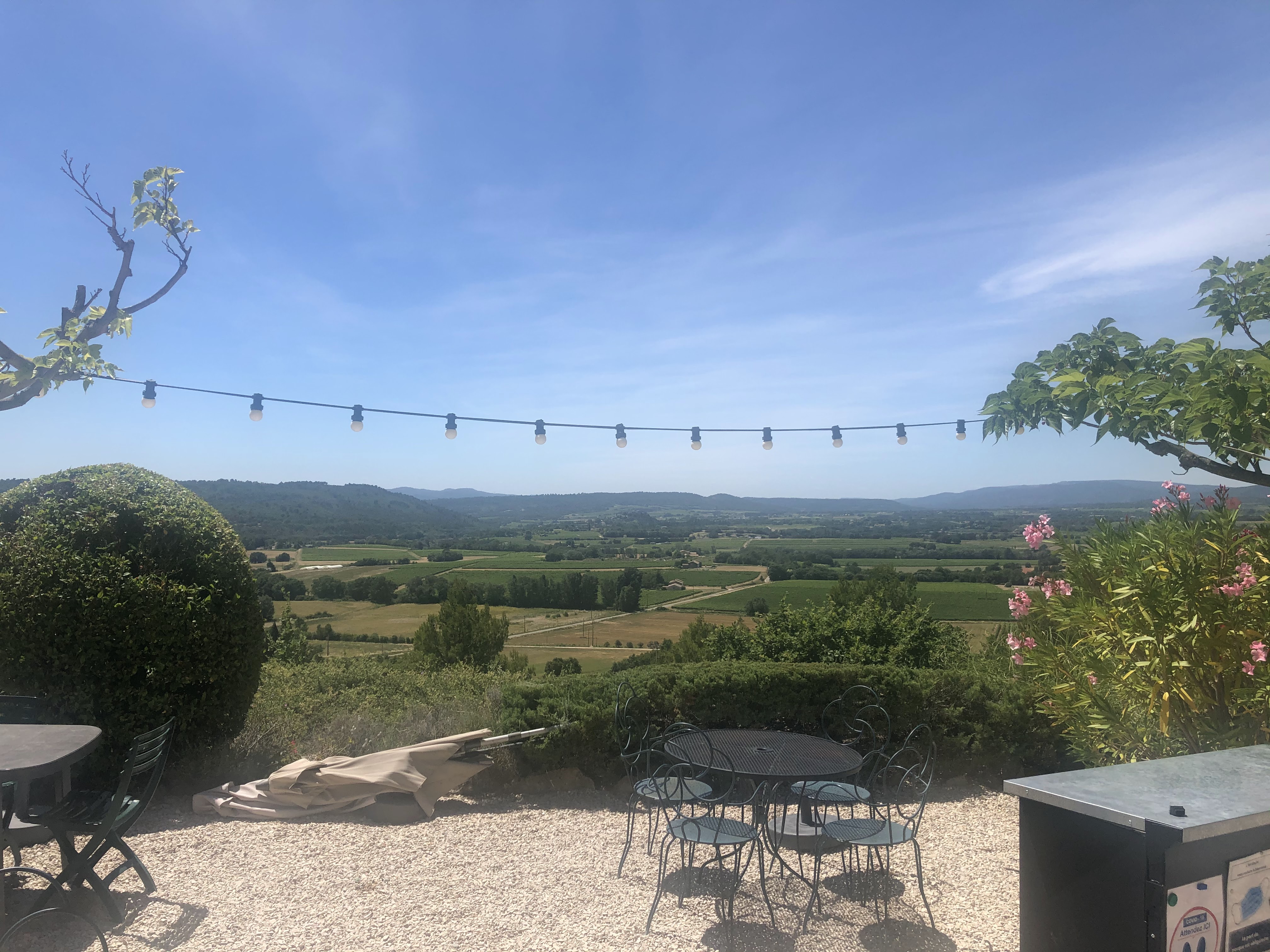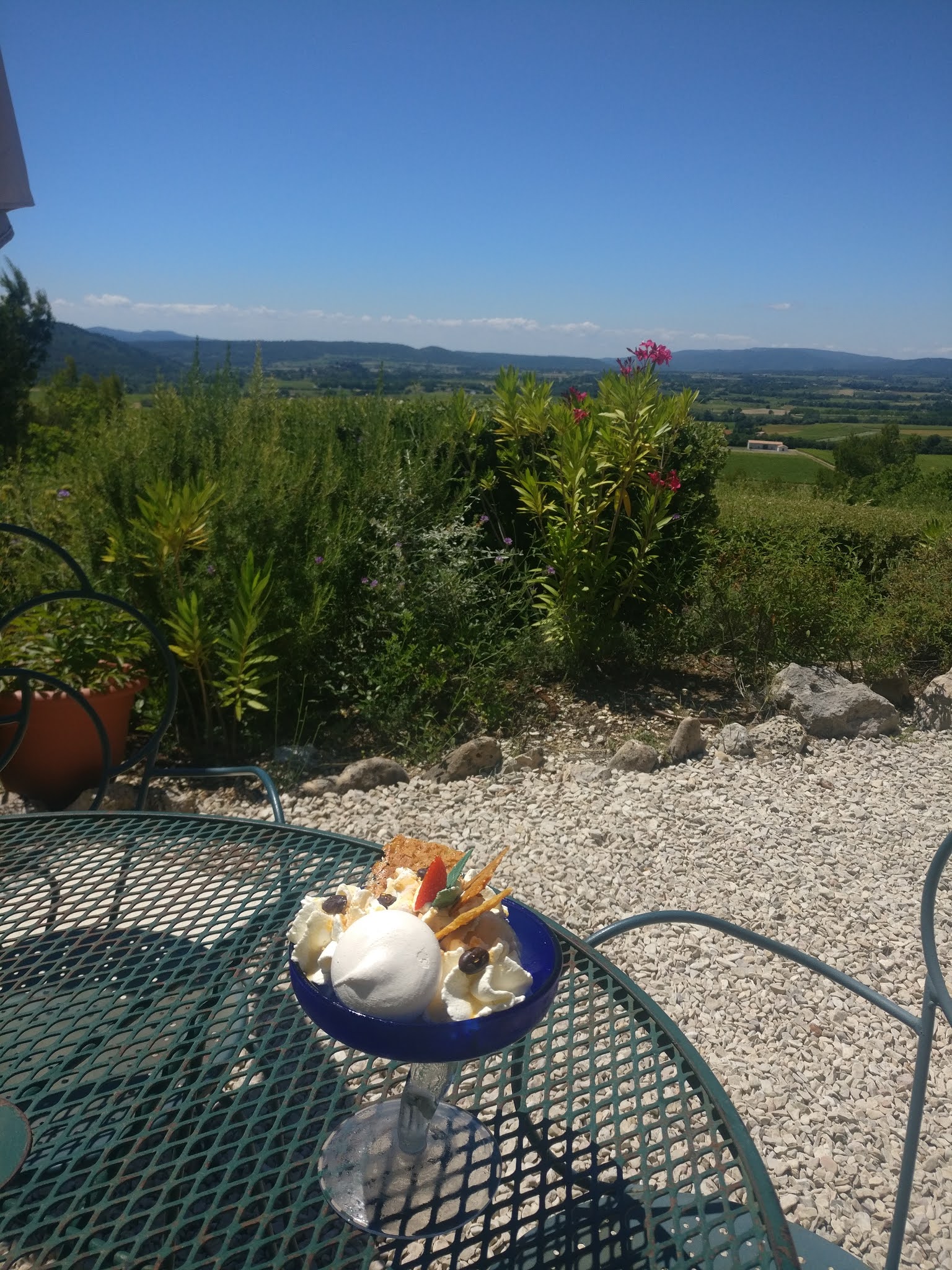 Le lieu offre une vue imprenable sur le Luberon. Magnifique ! Les glaces sont très bonnes mais les prix sont excessifs. De plus la vaisselle et la présentation des glaces est totalement kitch!