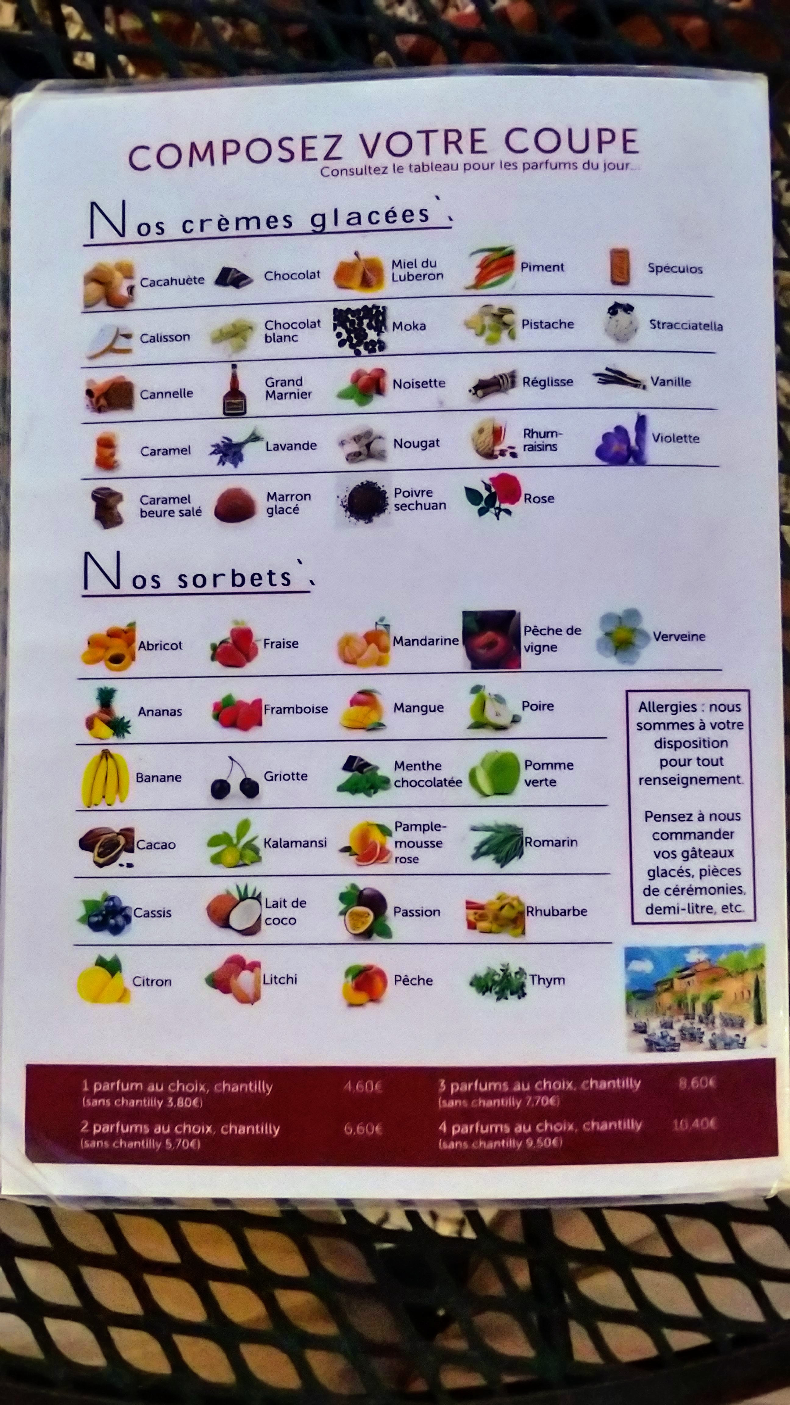 Parfums de glace de toute sorte. Nos préférés les parfums floraux : rose, lavande, violette mais aussi calisson, grand marnier etc...Un incontournable de l été ! Le seul bémol concerne le service qui a pu être moyen certaines années et les toilettes sur la terrasse Mais nous revenons quand même pour la qualité des glaces !