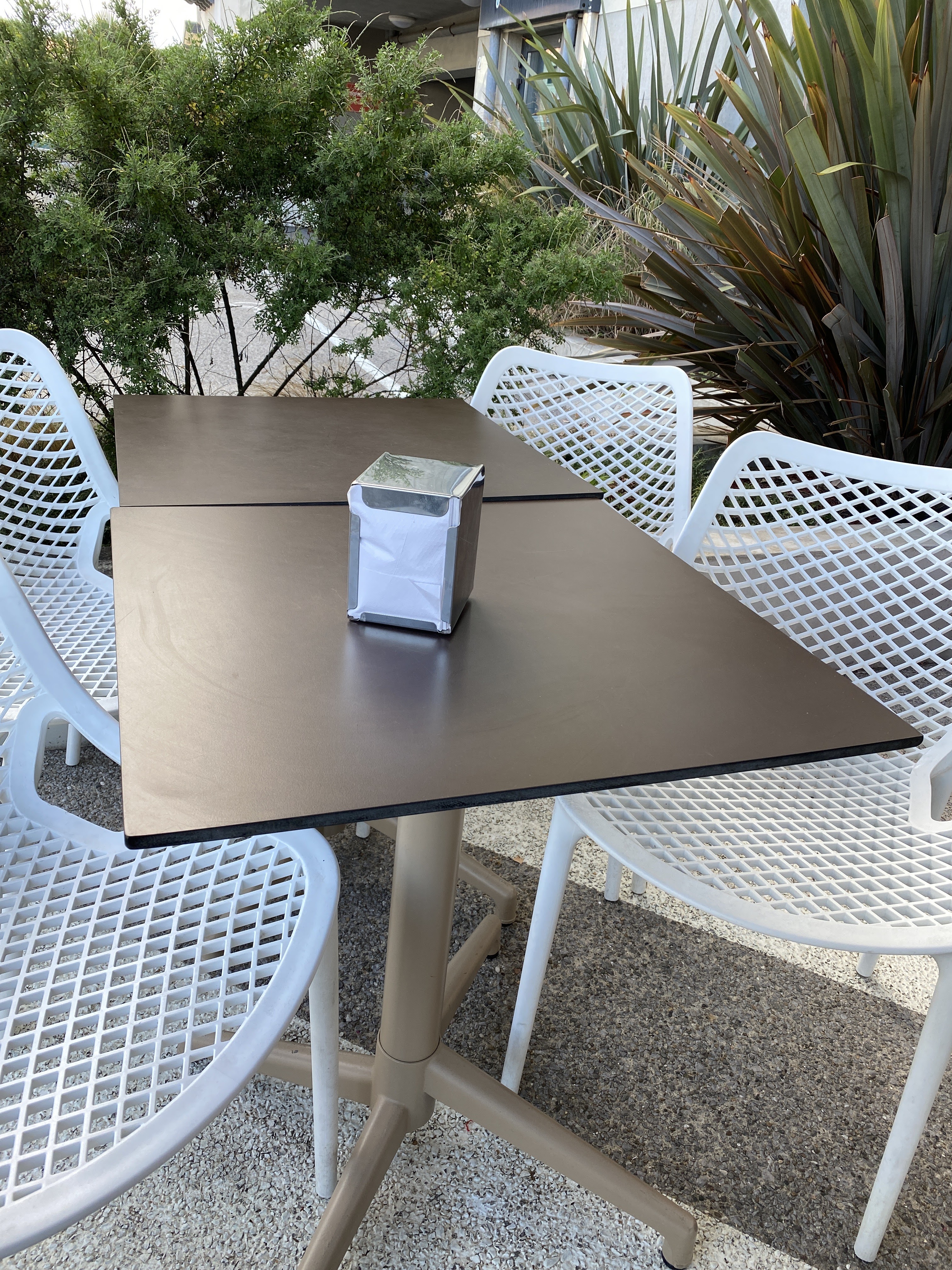 C'est pas la faute de mes serveuses professionnelles qui respectent mes consignes. Vous auriez dû aller vous assoir chez le glacier d'en face chez qui vous avez acheté le panini et la gaufre. Pas de chance ils n'ont pas terrasse. On ne viens pas chez moi consommer des produits achetés ailleurs. Il vous reste les bancs publics....
