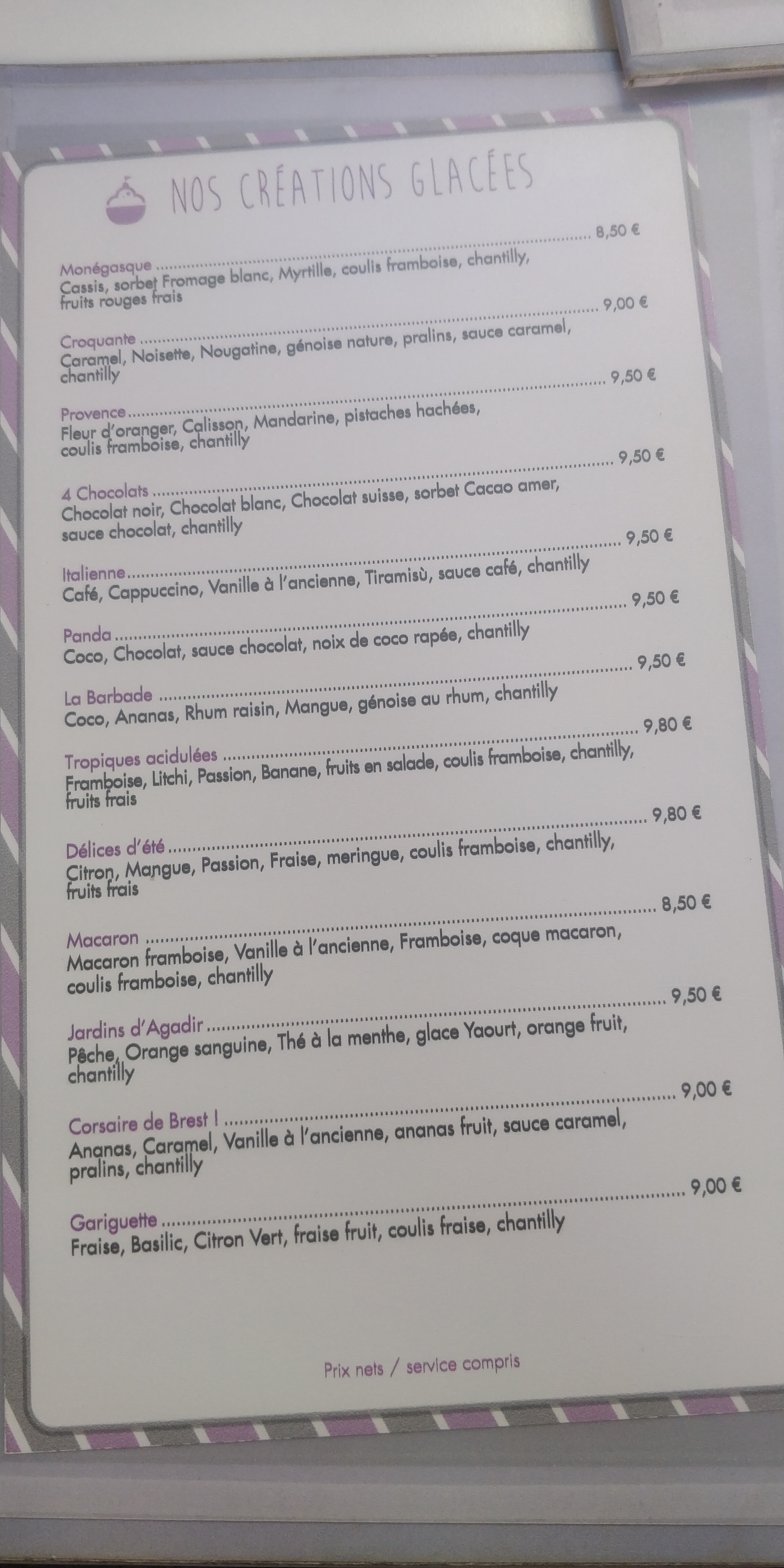 Glaces de qualité = entre 8 et 9 euros très bon accueil. Je recommande