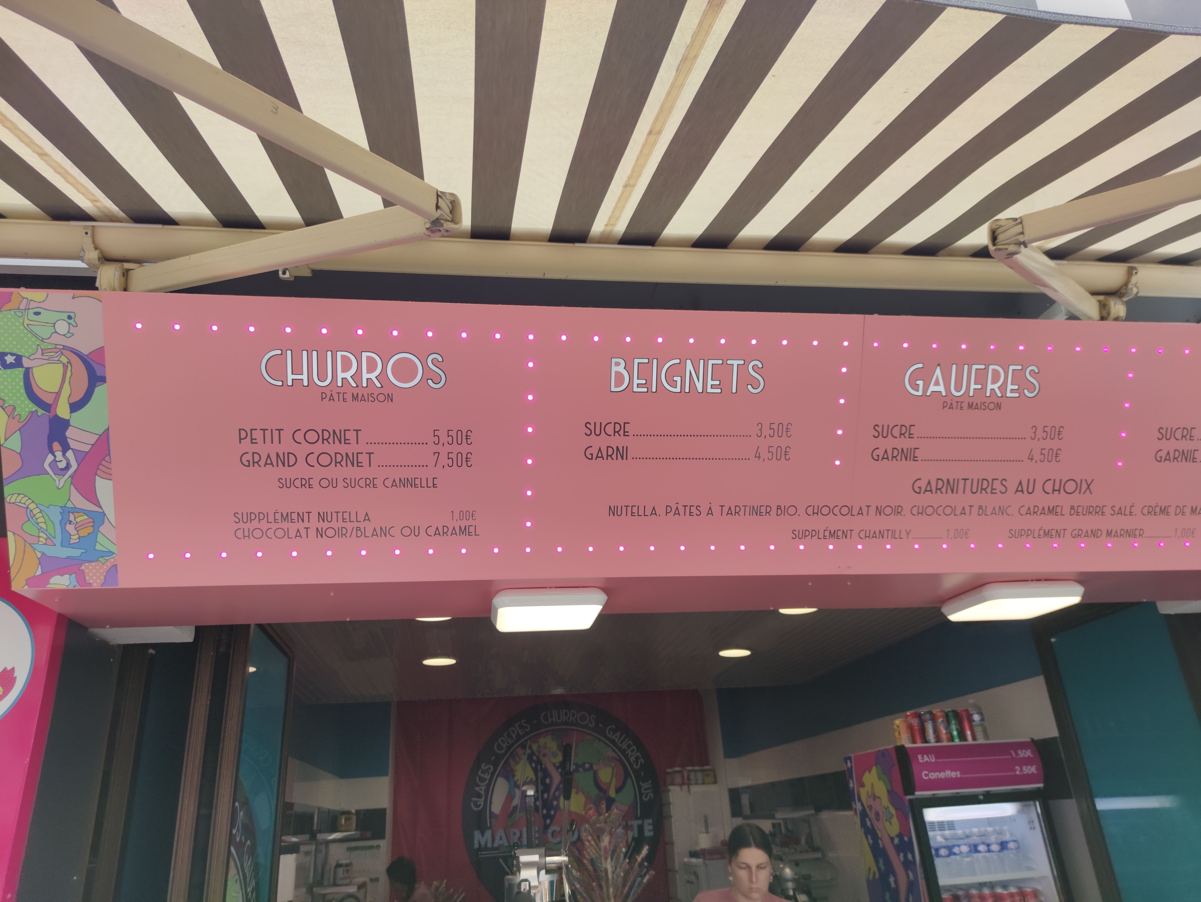 Crêpes au chocolat excellentes ! Servies rapidement et avec le sourire ! Mais il y en a pour tous les goûts : glaces artisanales, granités, gaufres, beignets, churros. La jolie décoration pop un peu rétro change des habituels néons de l'Avenue de la Mer. Une nouvelle adresse montoise à tester absolument !